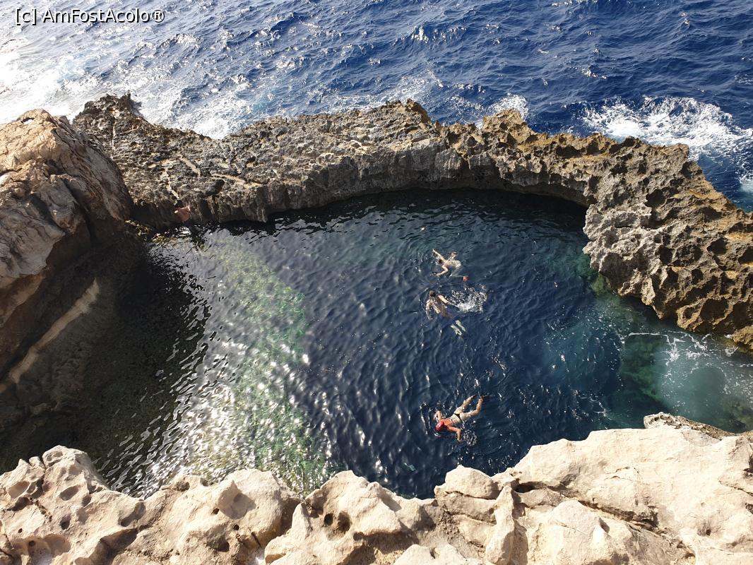 [P32] In aceasta zona a existat una dintre cele mai populare atractii turistice pe care Gozo le-a oferit pana in martie 2017, Fereastra albastra. Situata in spatele Blue Hole, a fost o stanca erodata de apele marii, care forma astfel o arcada, sustinuta de coloane cu diametrul de 40 m, prin care se vedea Marea Mediterana. Ce m-a uimit este faptul ca a disparul in mare nu doar arcada, ci si stalpul de sprijin care se afla in mare, astfel ca astazi nimic nu aminteste de ceea ce a fost.