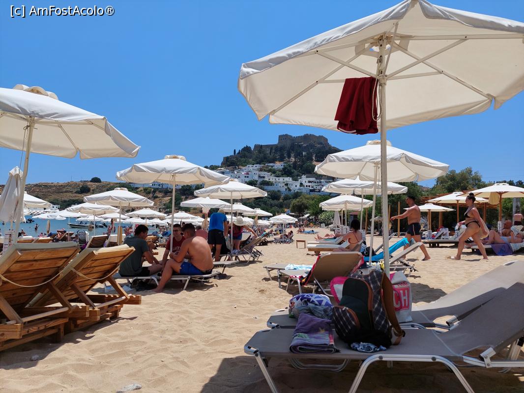 [P88] Plaja Lindos, printre șezlonguri.