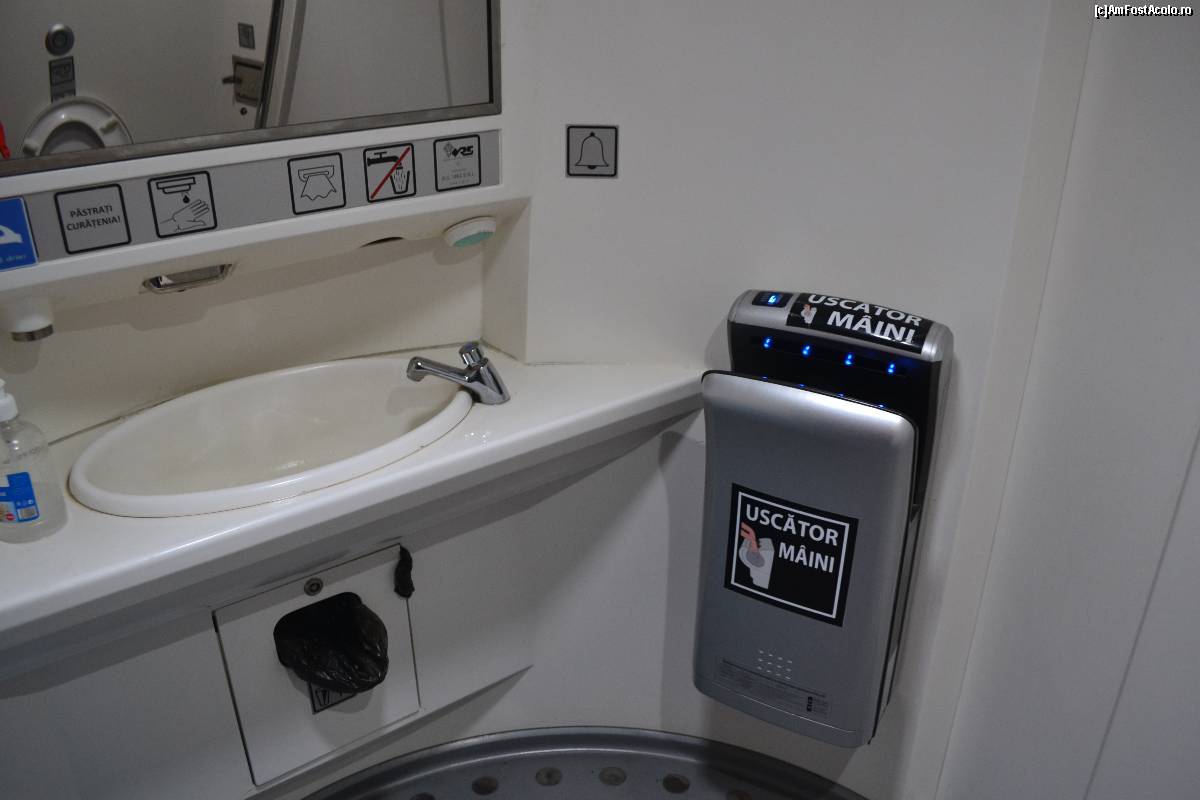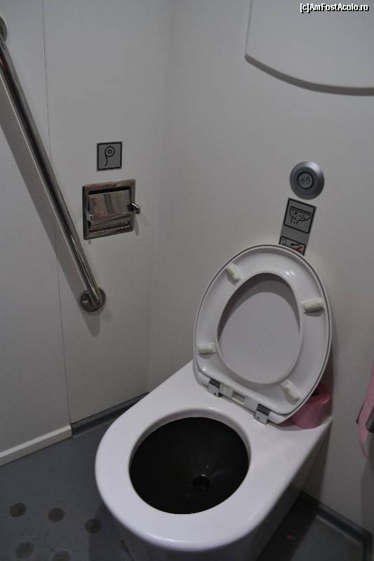 [P15] In stanga se poate vedea culoarul si persoane care stateau in picioare deoarece nu au mai gasit locuri libere. In dreapta, toaleta.
