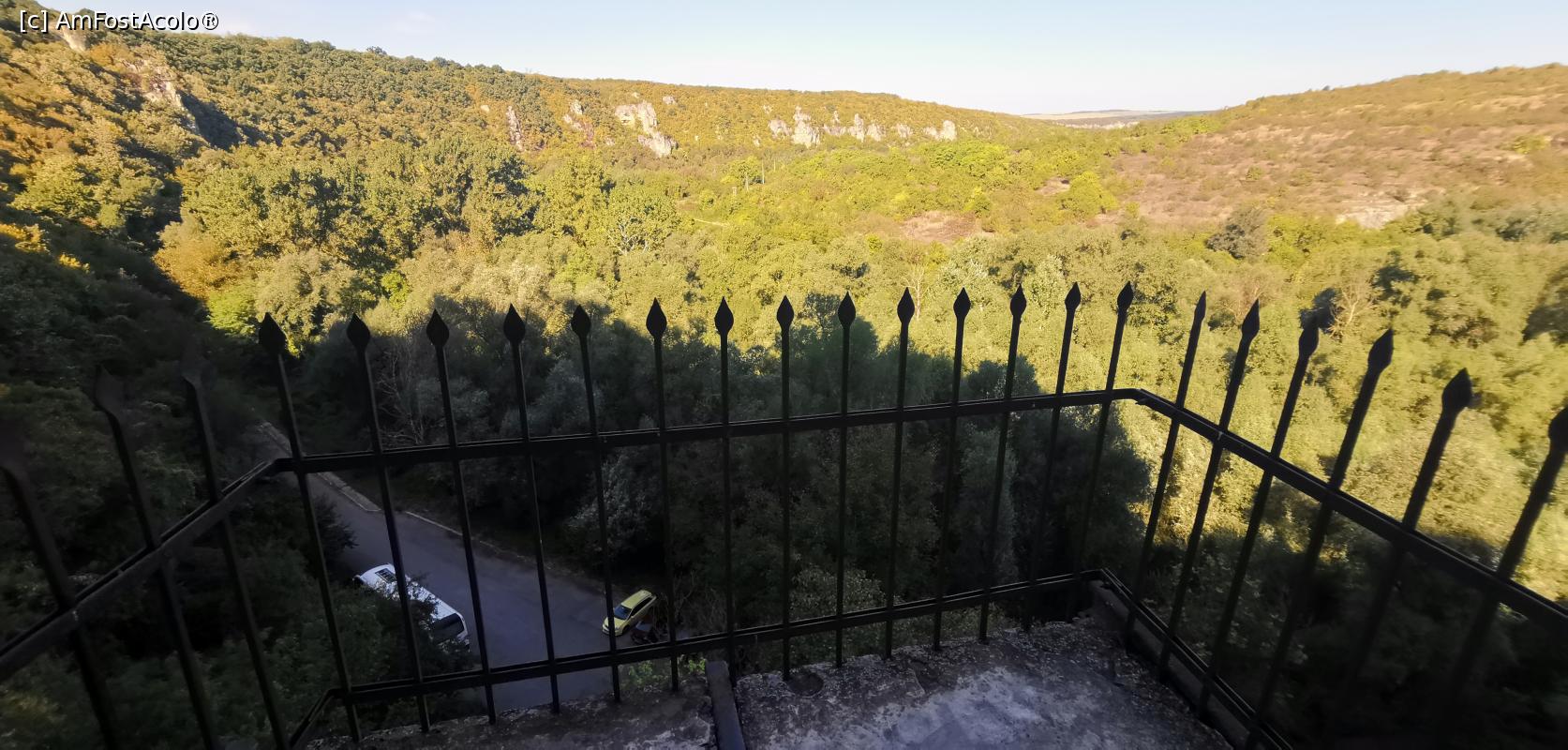 [P17] Biserica Sfântă Fecioara (Sveta Bogoroditsa), parte a mănăstirii rupestre Sfântul Arhanghel Mihail, vedere spre parcare din balcon.