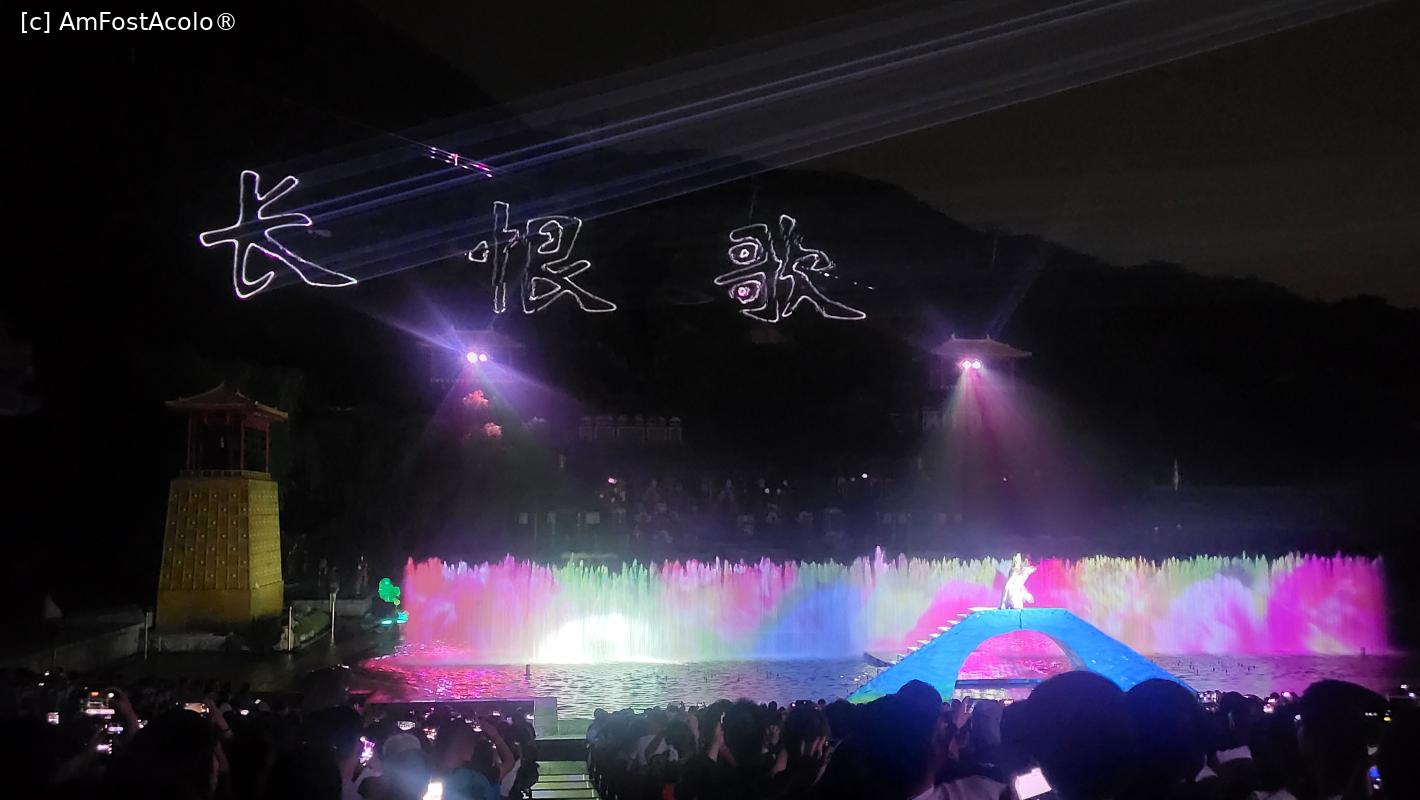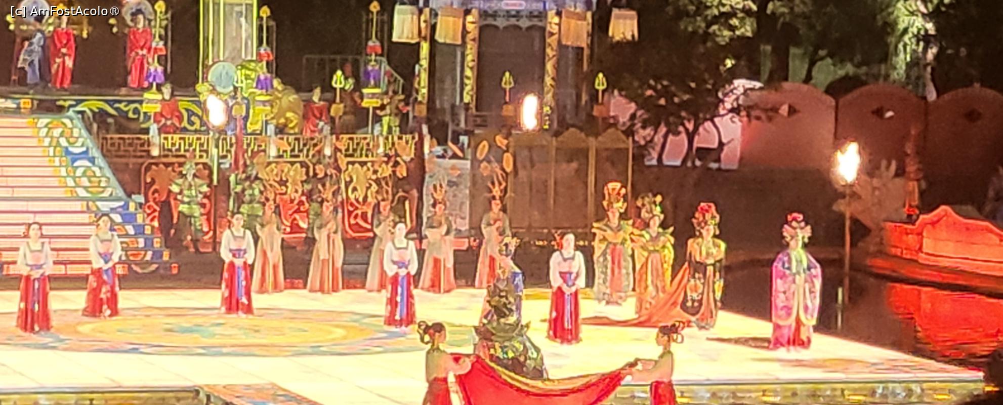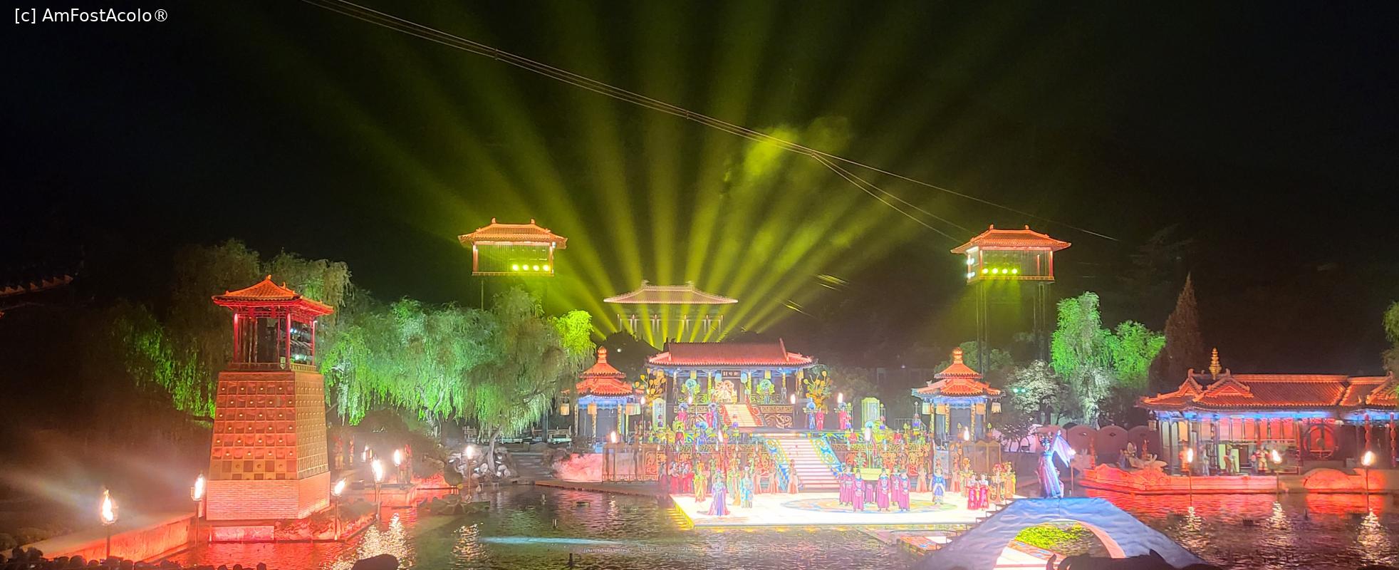 [P07] Sunt in total 10 scene, amplasate pe diferite nivele, in jurul lacului Jiulong, cu mii de lumini sclipitoare ce lumineaza muntele Lishan din fundal. Cateva sute de dansatori isi interpreteaza rolurile, sub efectele scenice elaborate, fantani arteziene, artificii si proiectii 3D, spectacolul fiind atat de real incat am simtit mirosul parfumului consoartei Yang atunci cand se scalda pe scena, caldura flacarilor simbolizand razboiul si burnita aparuta dupa moartea consoartei Yang.
