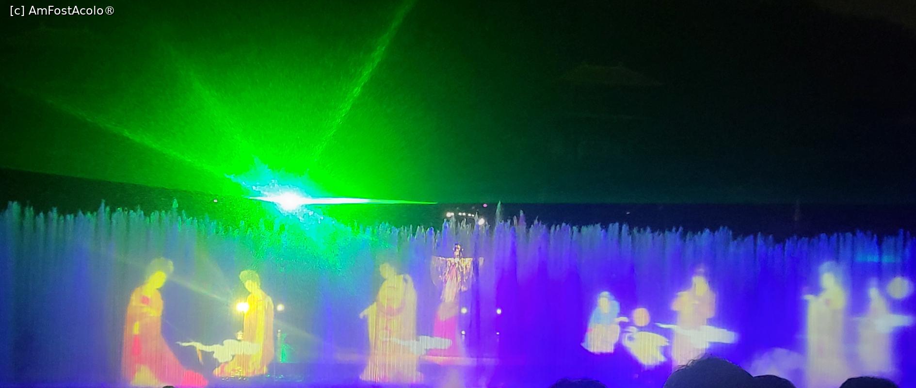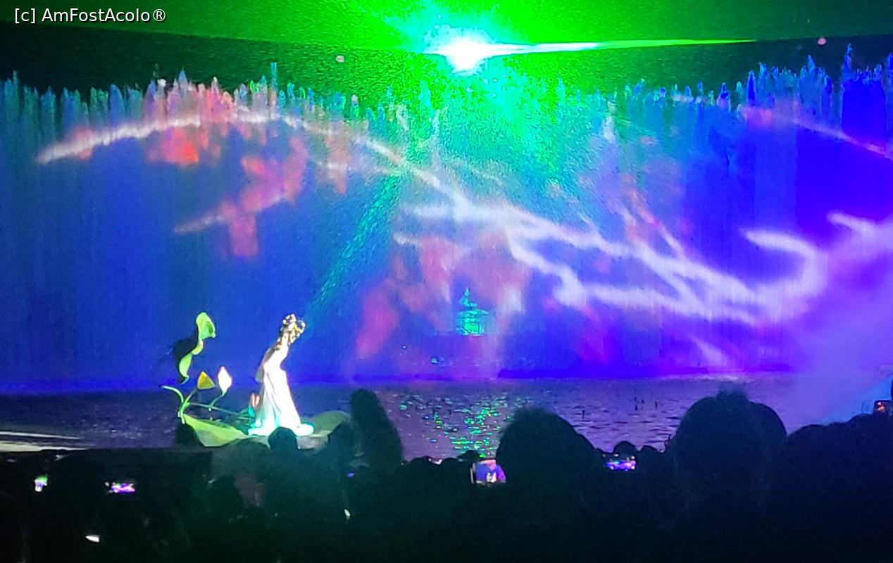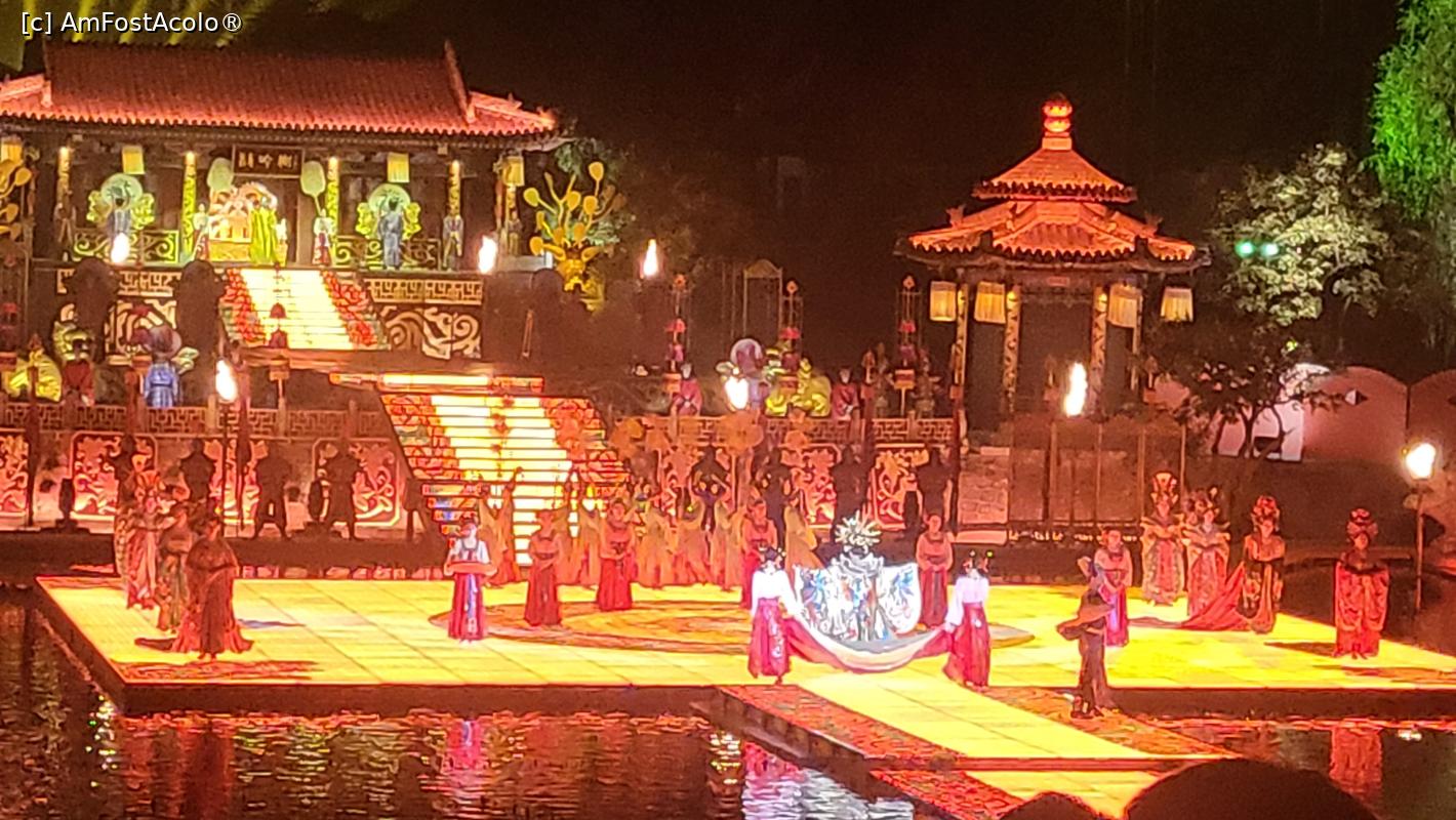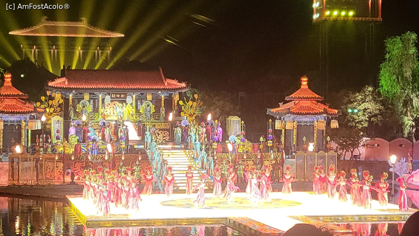 [P07] Sunt in total 10 scene, amplasate pe diferite nivele, in jurul lacului Jiulong, cu mii de lumini sclipitoare ce lumineaza muntele Lishan din fundal. Cateva sute de dansatori isi interpreteaza rolurile, sub efectele scenice elaborate, fantani arteziene, artificii si proiectii 3D, spectacolul fiind atat de real incat am simtit mirosul parfumului consoartei Yang atunci cand se scalda pe scena, caldura flacarilor simbolizand razboiul si burnita aparuta dupa moartea consoartei Yang.