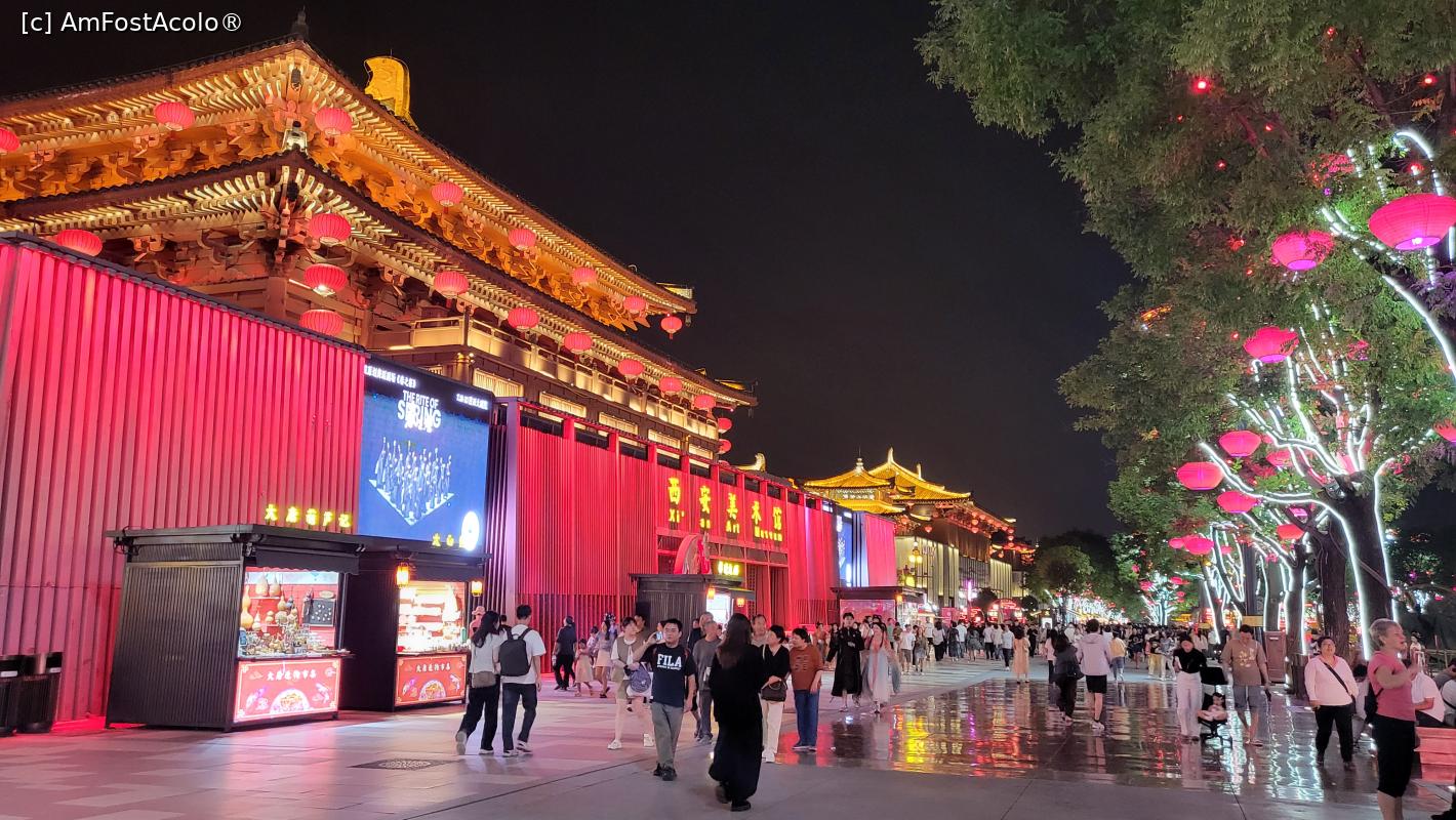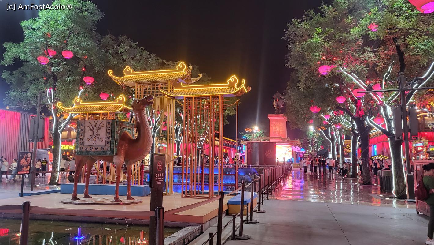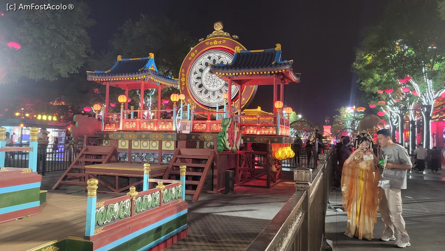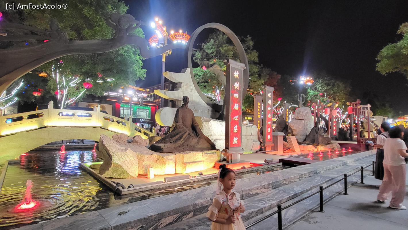 [P18] Pe langa statuile care ,,povestesc” despre prosperitatea dinastiei Tang si ne prezinta cele mai celebre personalitati ale acelei perioade, exista scene colorate pe care se desfasoara 22 spectacole, incepand cu ora 19, care dureaza cate 10 minute, ce prezinta cultura si istoria Dinastiei Tang prin forme precum dansul, compozitia si recitarea de poeme sau mici scenete. Nu te poti sincroniza astfel incat sa asisti la toate, dar poti vedea cateva, in timpul plimbarii intre scuaruri.