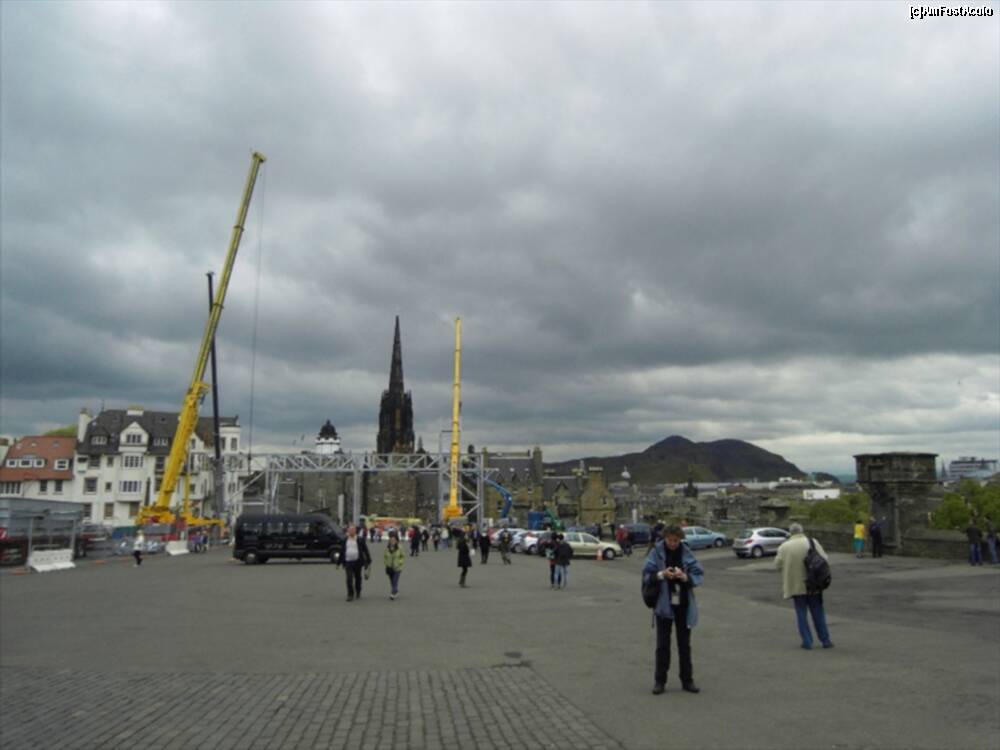 [P52] Esplanada, vazuta cu spatele la castele. Macaralele lucrau la construirea tribunelor pentru Tatoo. Cladirea cu alb e Camera Obscura, iar turla neagra e a Tolboth Church.