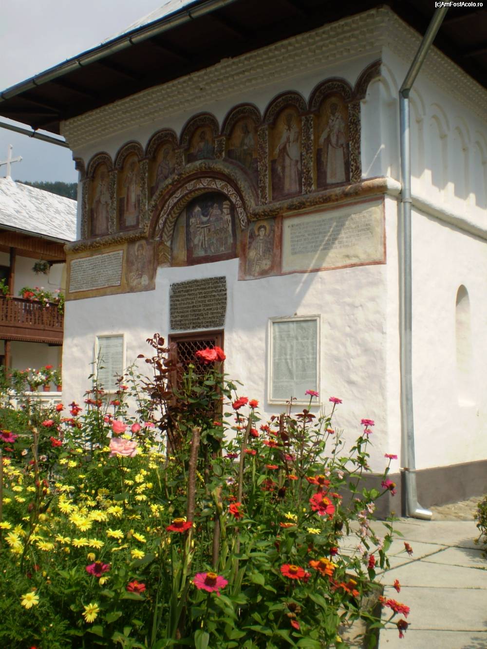 [P01] Schitul Iezer in Septembrie 2009. Aici, in stanga si dreapta intrarii sunt informatii despre istoria acestui loc, plecand de la ctitorii Mircea Ciobanul si sotia sa Doamana Chiajna (1552)si ajungand mai aproape de zilele noastre cand viata monahala dusa de calugari a fost preluata de maicute(1946)