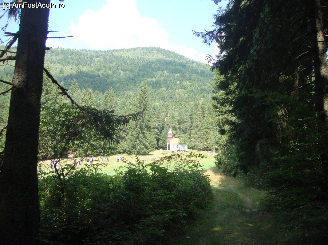 [P23] După repriza de plajă ne-am hotărât să dăm ocol lacului. Se observă capela din vecinătatea lacului. Noi am cules zmeură în partea dreaptă a acestei poienițe.