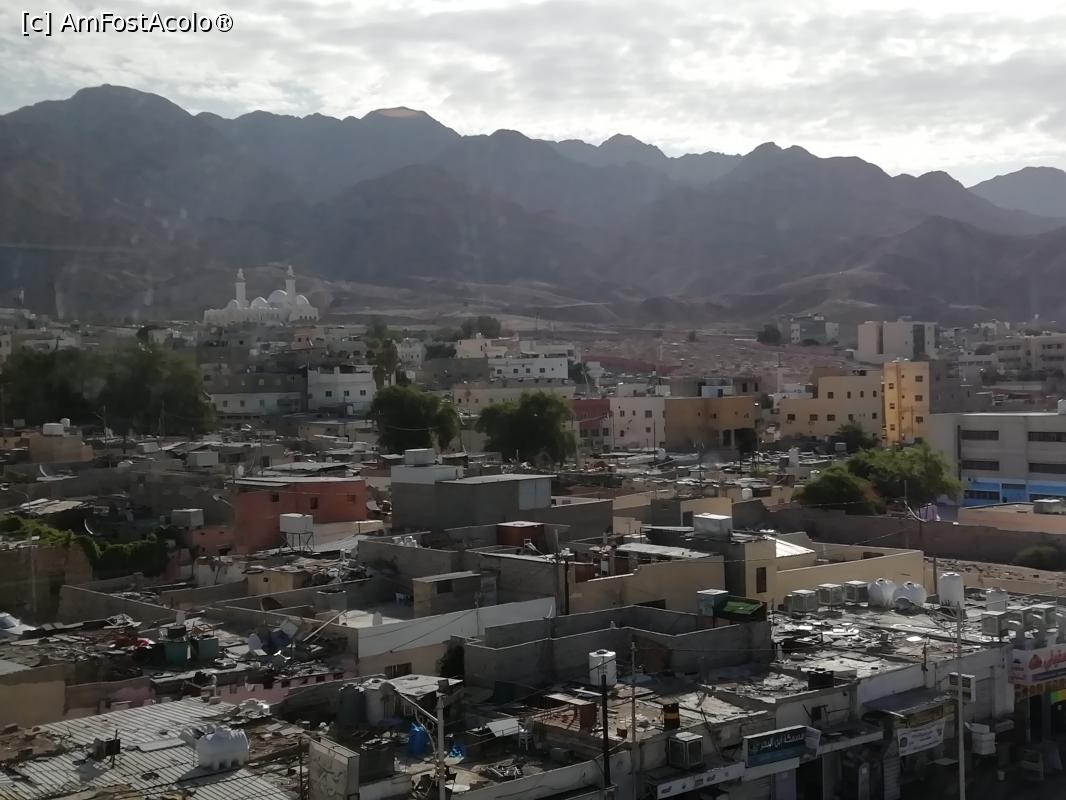 [P12] Puțin peste umăr, în dreapta și în depărtare, e moscheea de la poalele munților. privire tot din restaurant