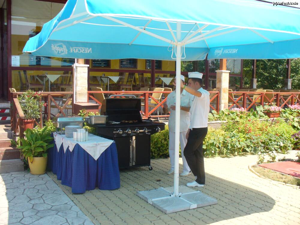 [P37] Intrarea catre restaurant. In dreapta gratarul, in stanga un spatiu cu masute si scaune de plastic aferent pool-barului