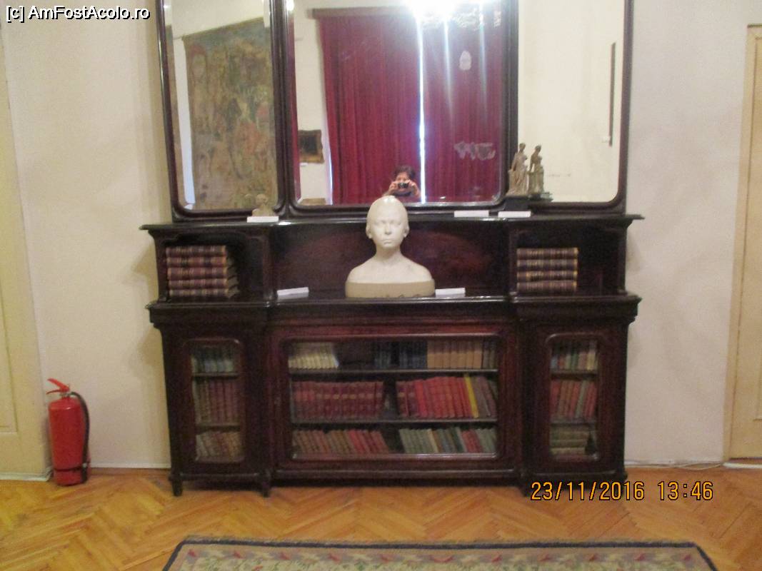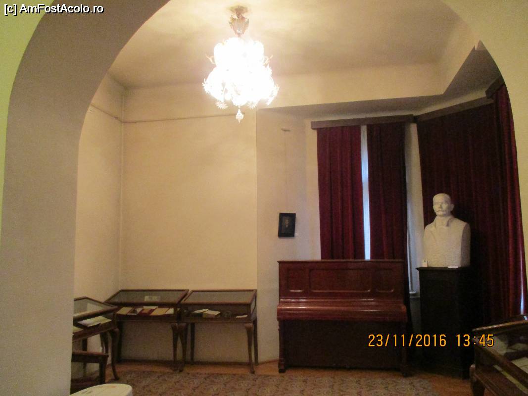 [P22] Vitrine, pianul si bustul savantului.