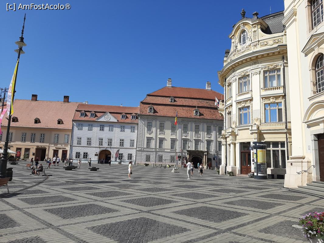 [P04] De la stânga la dreapta: Casa von Frankenstein, Casa Albastră. Palatul Brukenthal, Primăria și un colț al Bisericii Romano-Catolice.