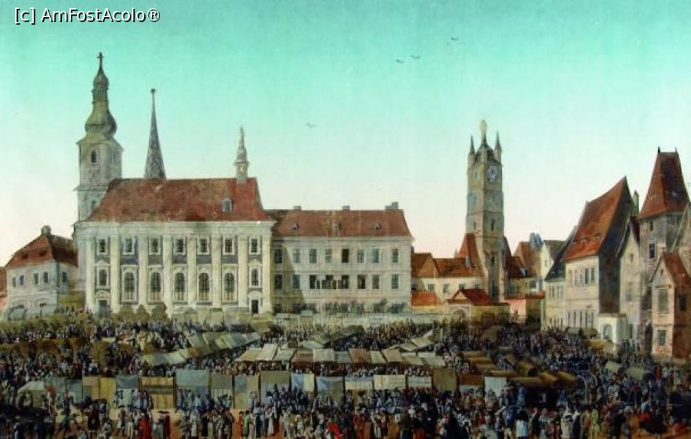 [P05] Franz Neuhauser - Târgul din Piața Mare (cca 1790). De remarcat acoperișul Turnului Sfatului: acele patru turnulețe înseamnă că orașul avea dreptul de a pronunța pedeapsa cu moartea în cadrul unui proces. De asemenea, de observat clădirile din dreapta: aveau mai multe etaje decât au azi.