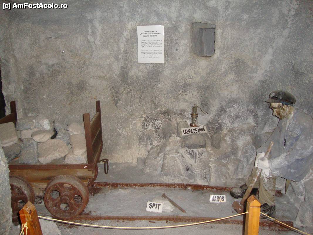 [P07] Al doilea tip de exploatare pe care ghida l-a prezentat a fost exploatarea sistematică cu mai multe camere. Minerul se odihnește lângă vagonetul încărcat cu bucăți de sare.