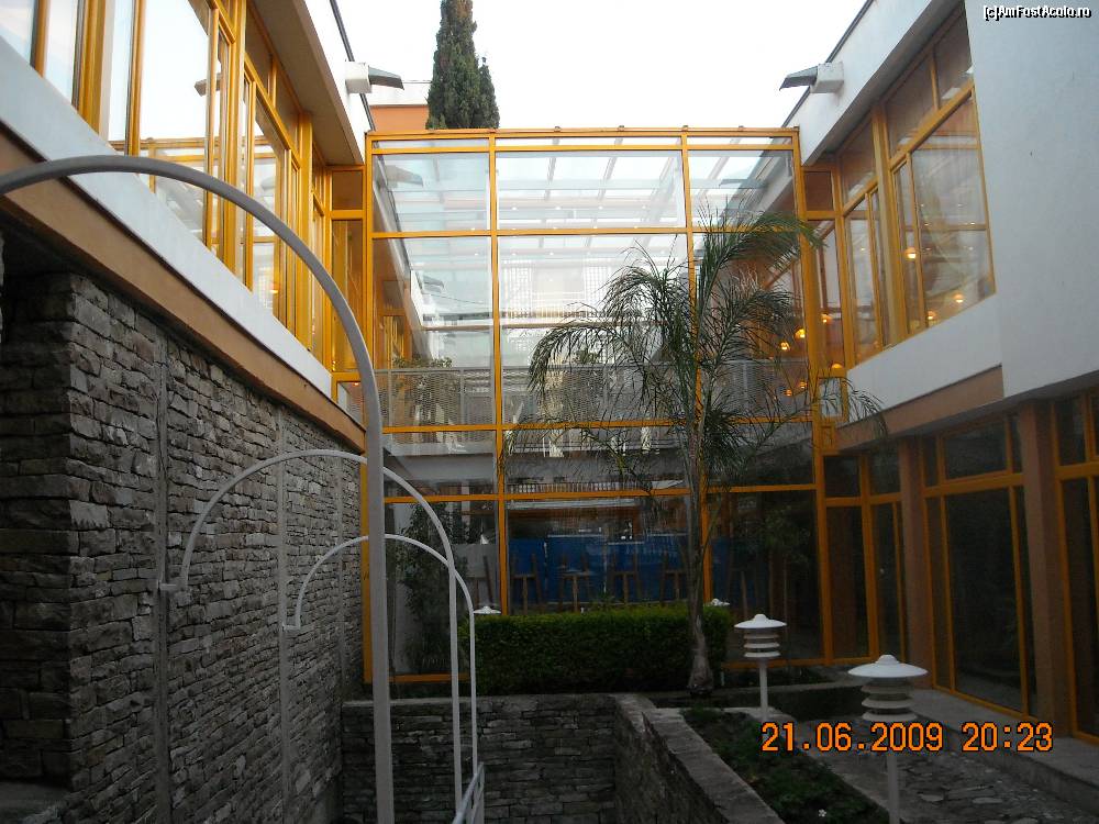 [P07] sus este pasarela inchisa cu sticla care face trecerea intre salile de masa. Sub ea, o curticica interioara
