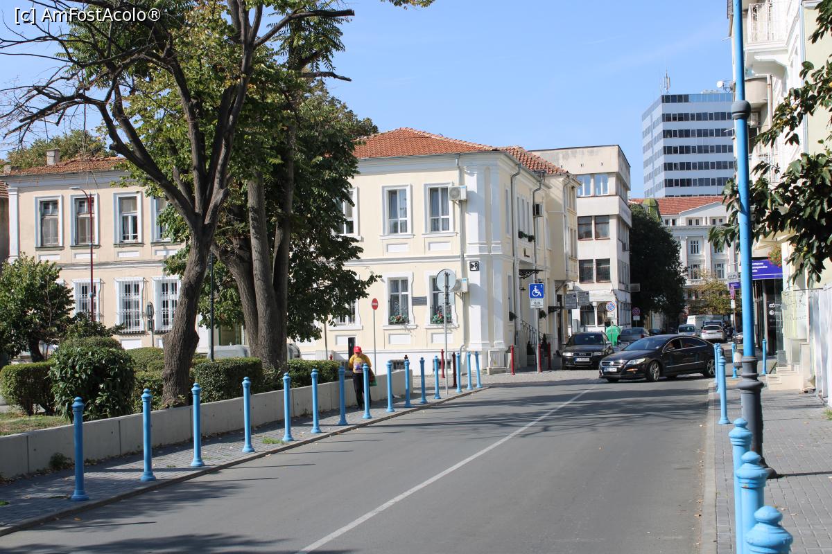 [P03] Burgas, No 13 Boutique House, clădirea albă văzută de pe strada Mitropolit Simeon de lângă Sinagogă, în plan secund se vede Hotelul Bulgaria, clădirea înaltă cu nuanțe de albastru...