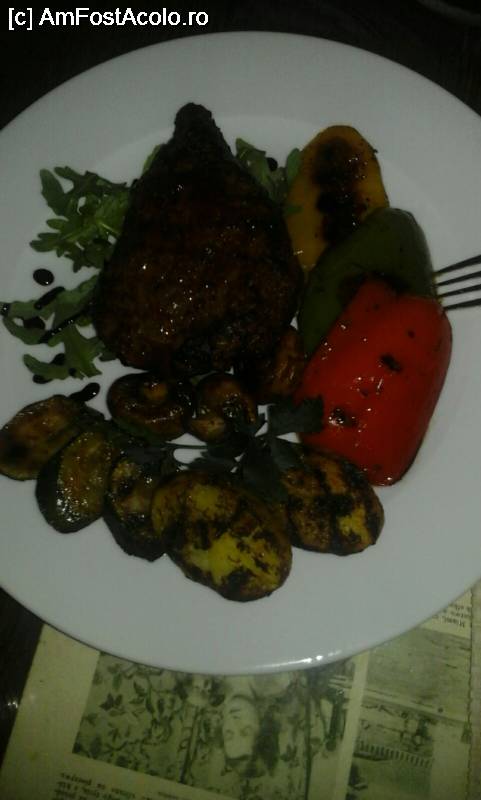 [P19] friptura de vita cu legume la gratar pentru Bogdan cu farfuria asezata pe un ziar...