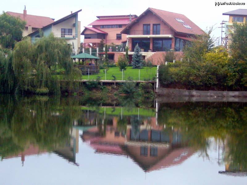 [P16] Domeniul Palatului Mogosoaia, vilele situate pe partea cealalta a lacului oglindite in lac, vedere din spatele Palatului