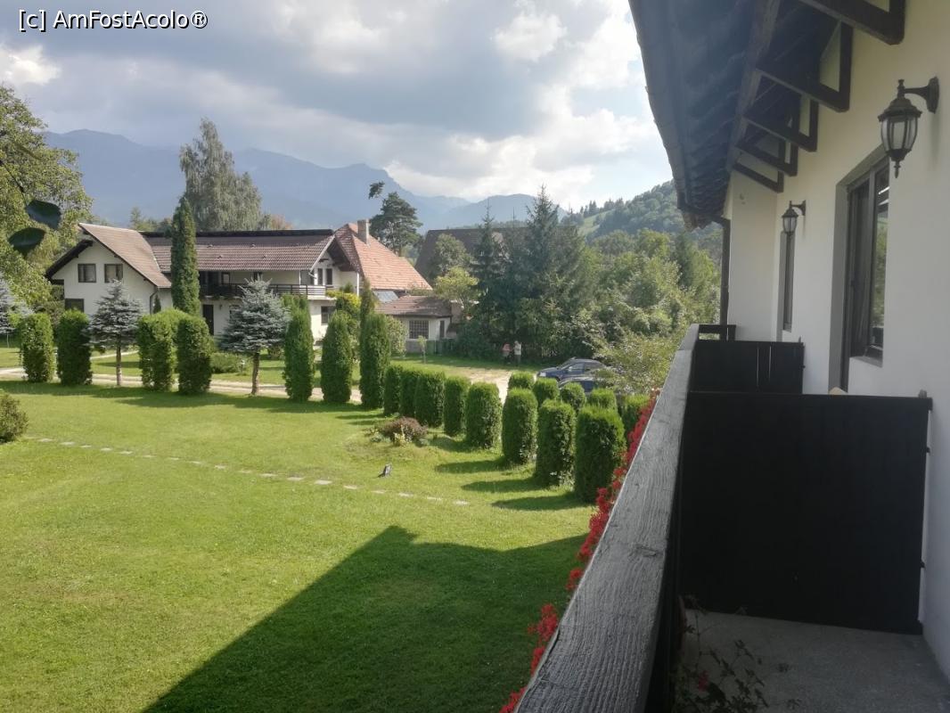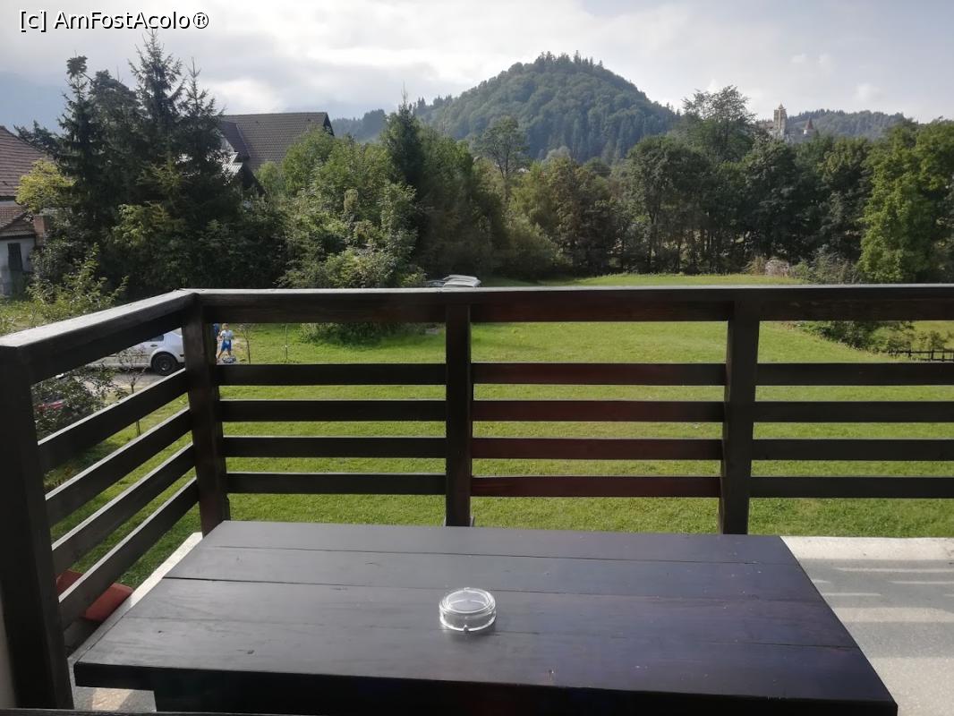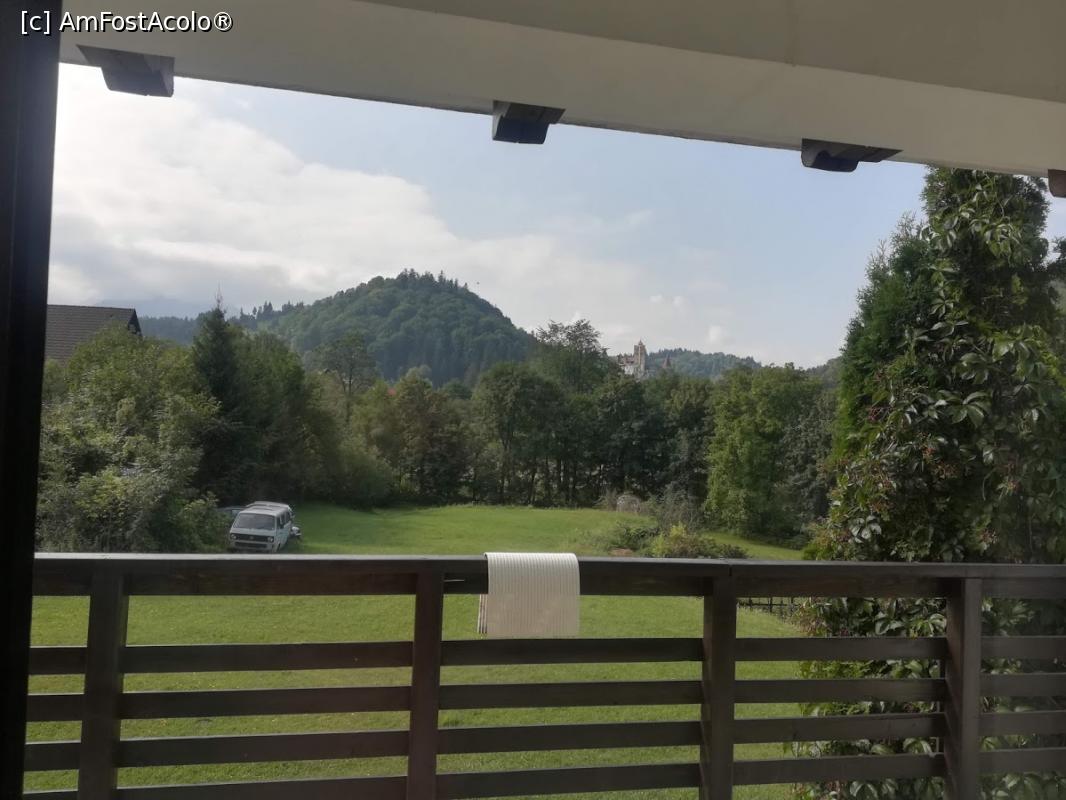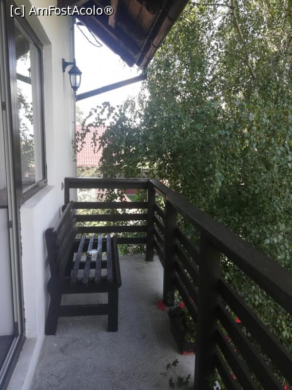 [P24] pensiunea, la etajul 1 unde am stat noi se poate observa terasa cu 2 bancute si cu vedere spre castelul Bran