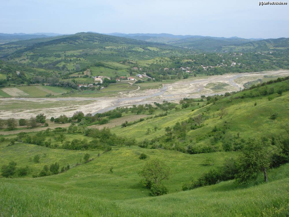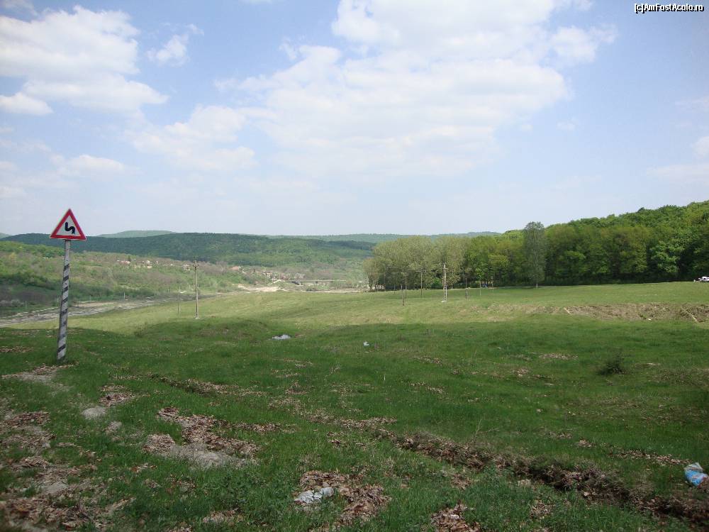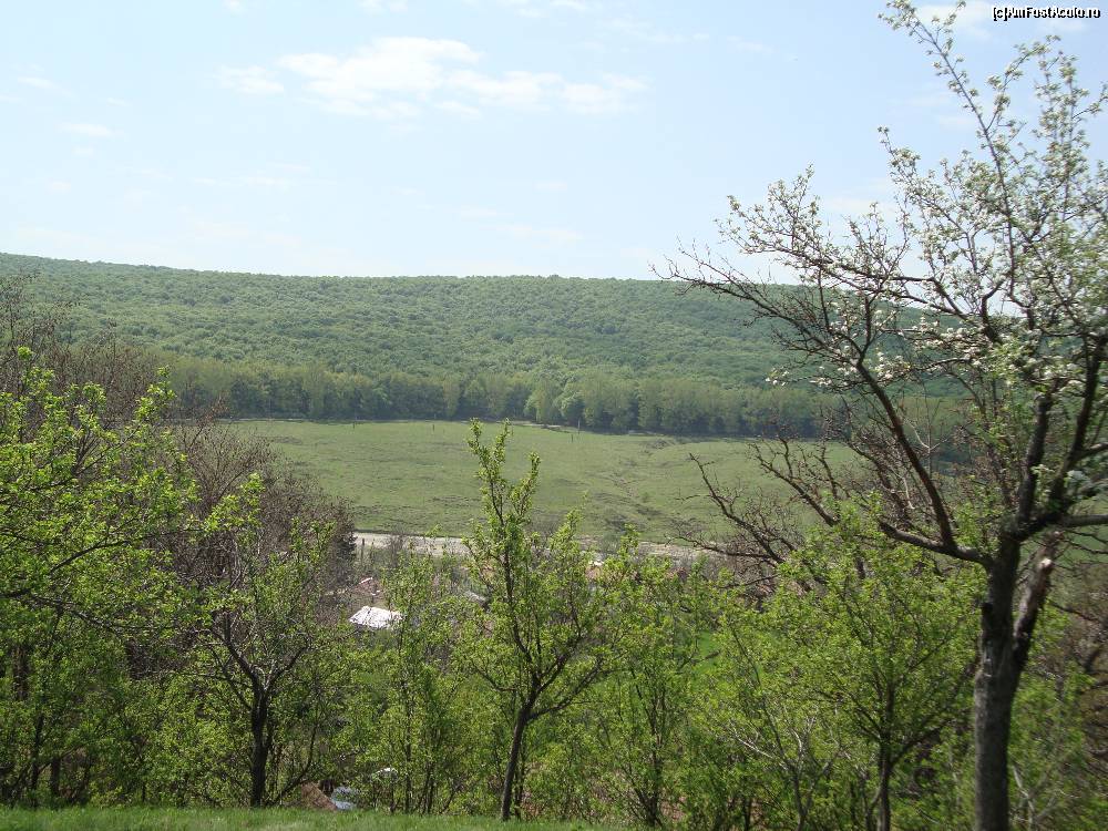 [P51] În depărtare, dincolo de albia râului Râmnicu Sărat, se vede satul Ceairu (aprilie 2012). Pădurea stăpânește și dealul opus.