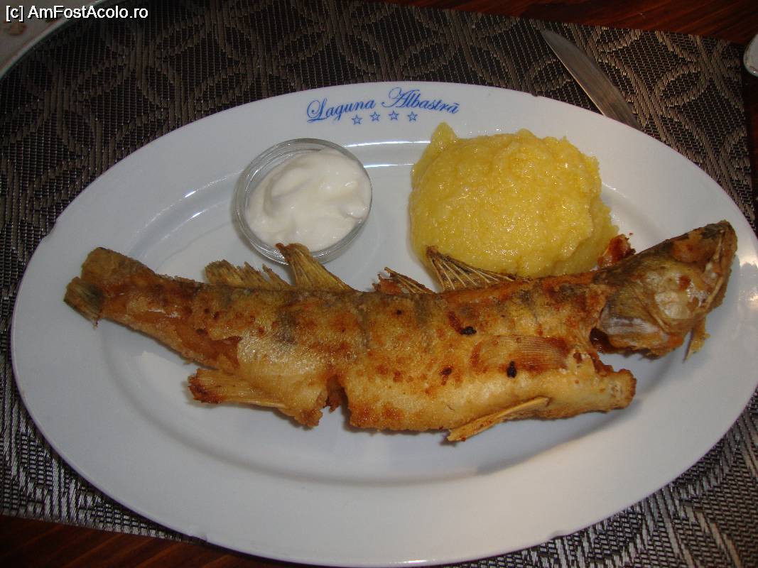 [P13] Una dintre cele două porții de șalău prăjit cu mujdei și mămăliguță. Peștele a fost bine preparat, nu au rămas decât oasele din el la final! :) Eu mi-aș fi dorit un pic mai multă mămăligă.