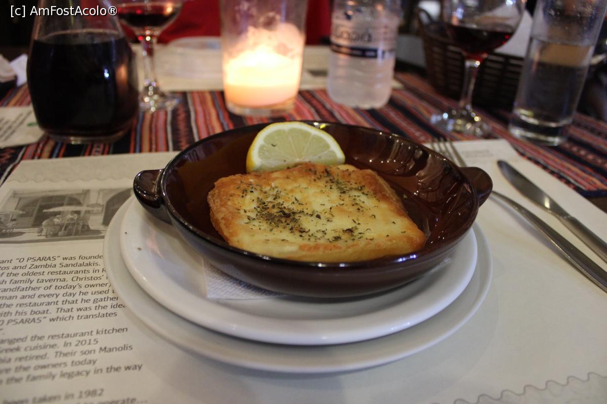 [P27] Rethymno, Restaurantul O Psaras, Saganaki cu brânză, foarte plăcută, se vede și suportul cu povestea restaurantului....