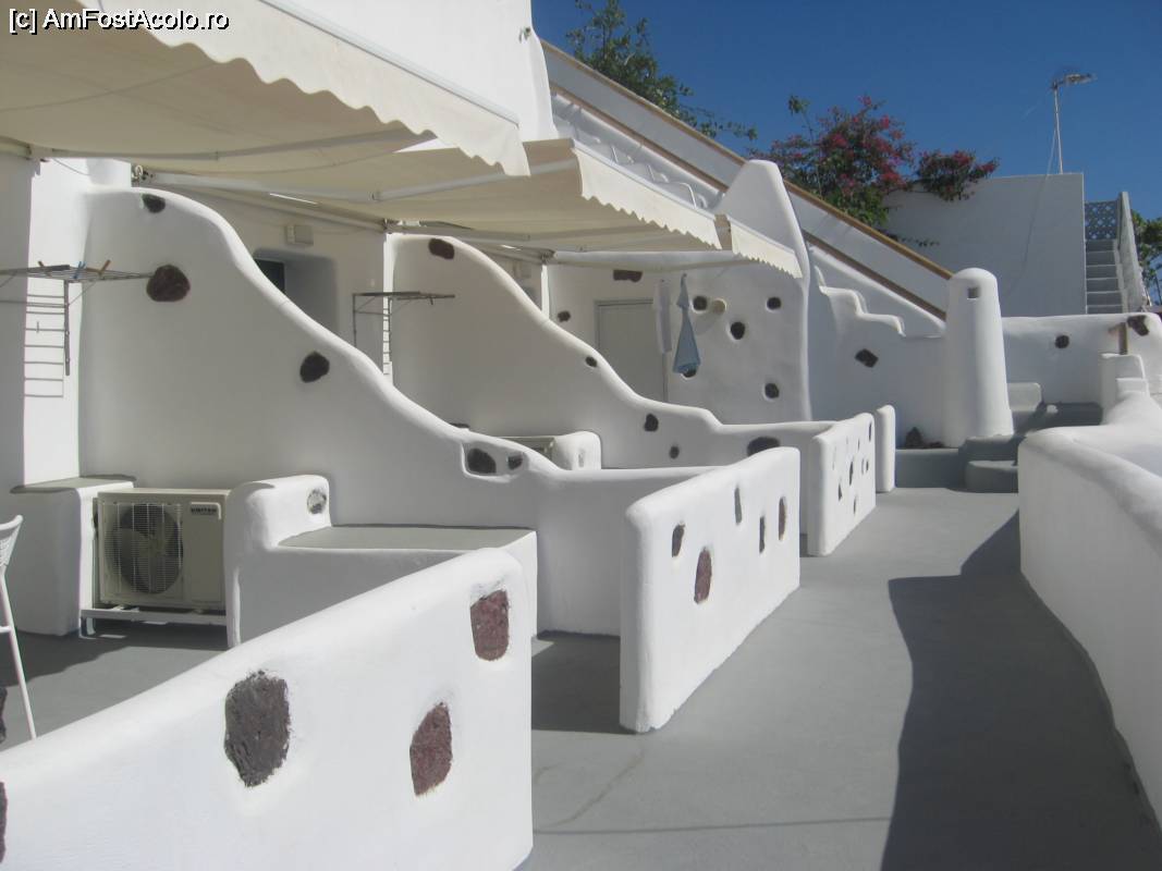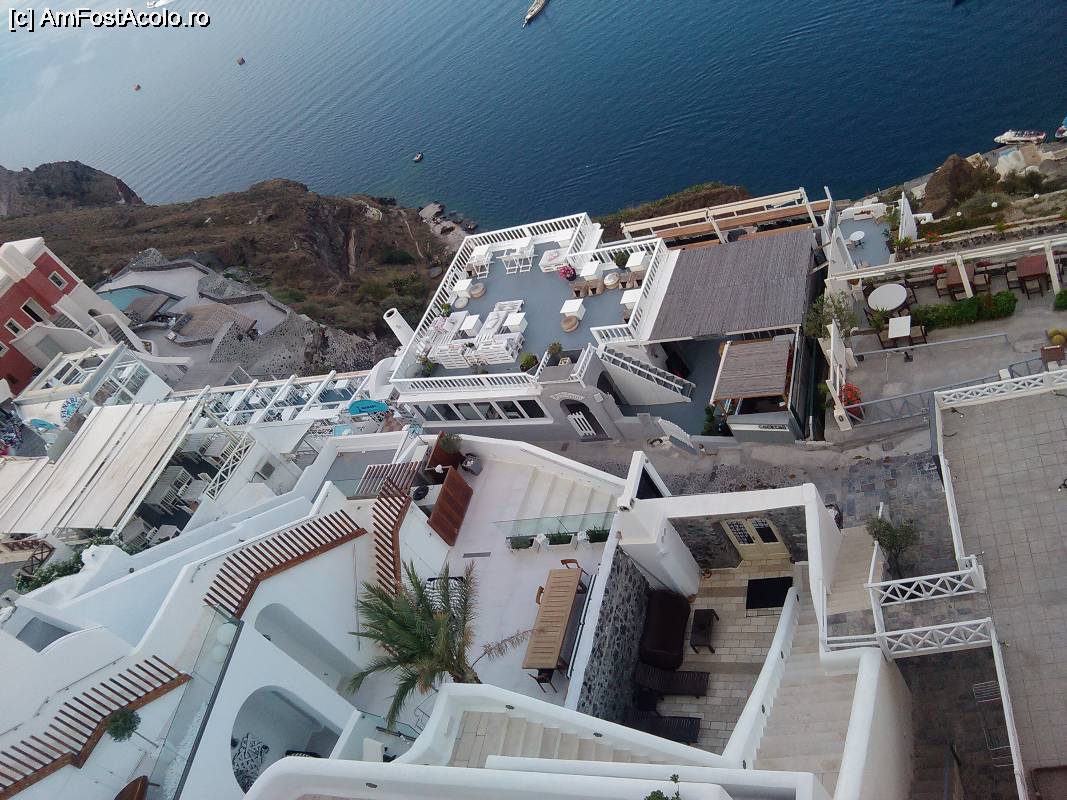 [P08] Imagine din Fira, Caldera, cateva terase si apartamente si un restaurant, dimineata devreme