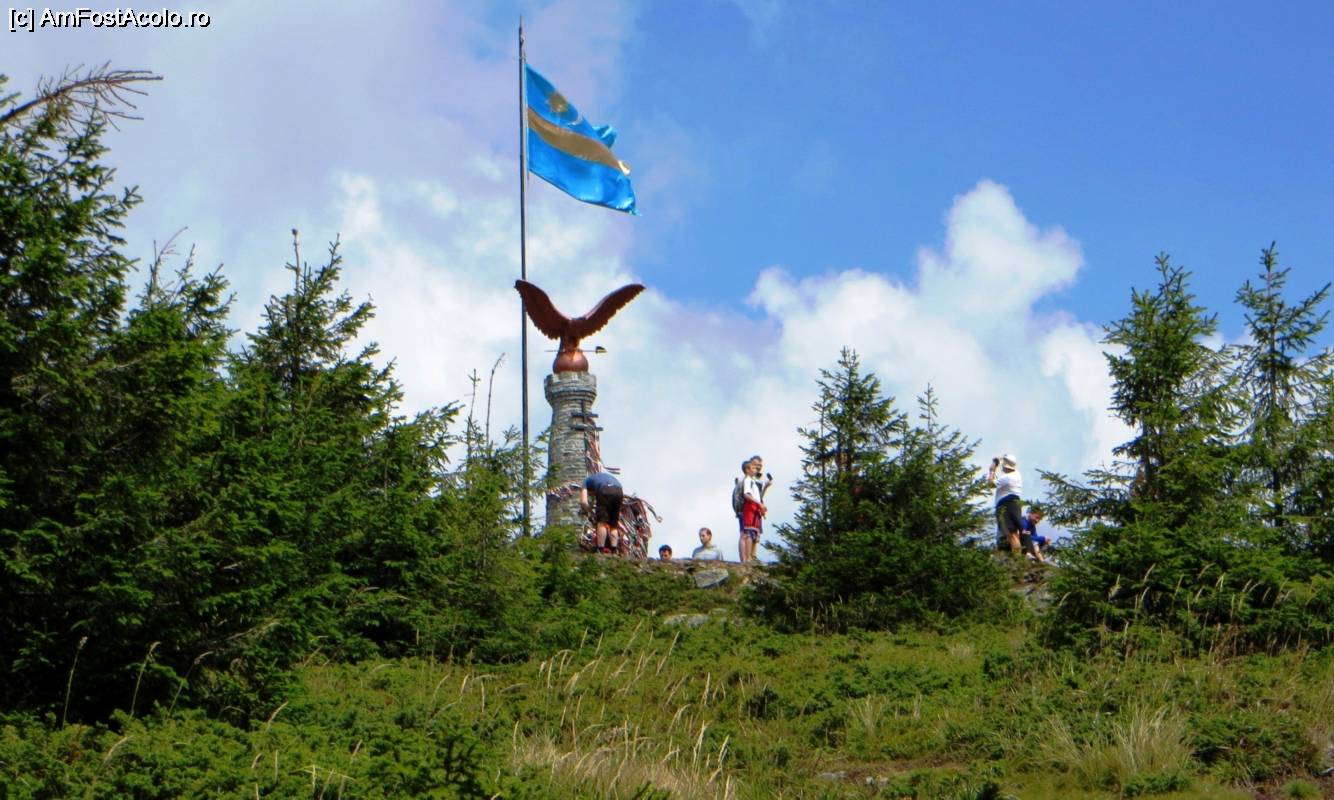 [P16] Două simboluri care te întâmpină odată ajunşi spre vârful Harghita-Mădăraş: steagul secuiesc şi Pasărea Tur (din mitologia maghiară)