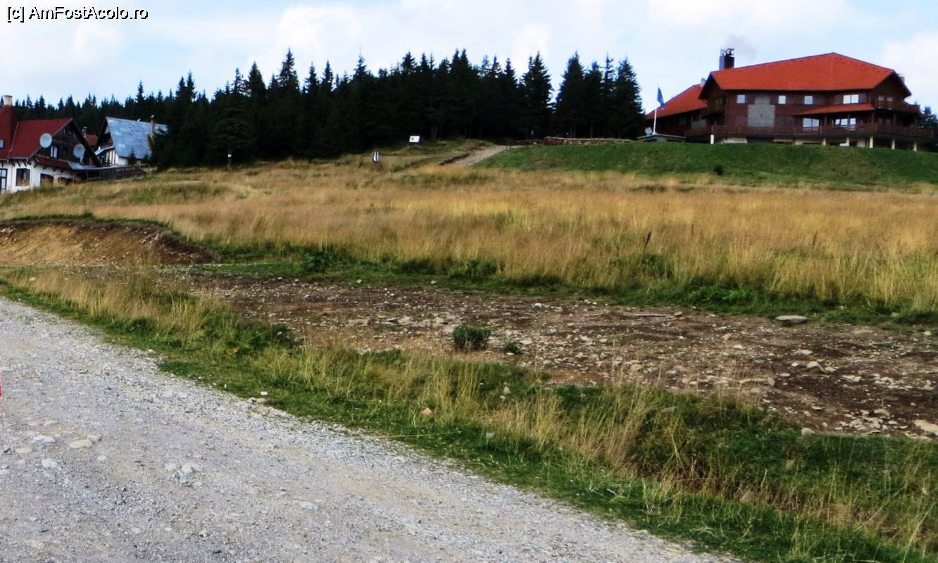 [P27] Detaliu din staţiunea Harghita-Mădăraş. Drumul spre vârful Harghita-Mădăraş continuă spre stânga, în urcare uşoară, de la cabana cu acoperiş roşu.