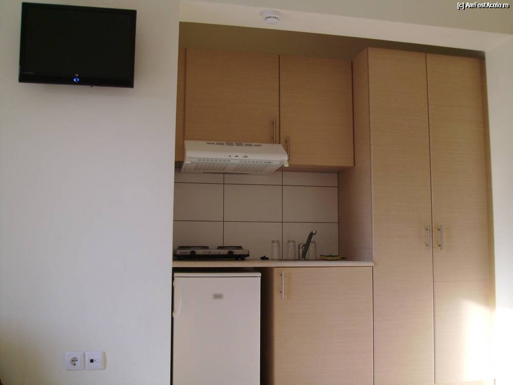 [P02] Vedere ansamblu 2 Villa Ikaros - TV LCD, Hota, Sifonier, Frigider, Dulapuri vase si tacamuri, chiuveta.