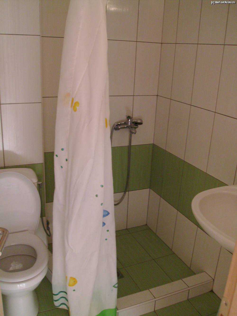[P04] Vedere ansamblu 4 Villa Ikaros, Baia - Dus, WC, Chiuveta, (uscator de par situat in dreapta chiuvetei), Perdea.